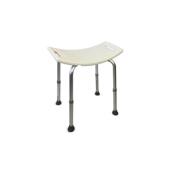 Banqueta sin respaldo fabricada en aluminio y PVC blanco, cuya función es facilitar la higiene del usuario.